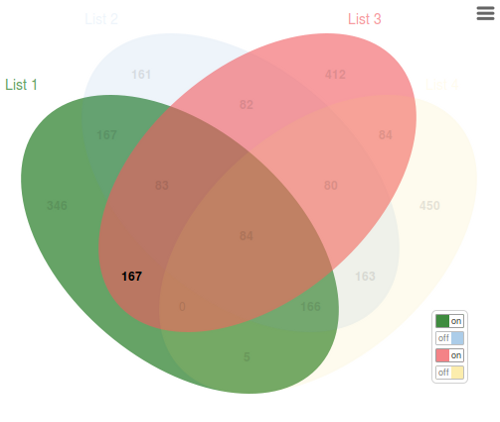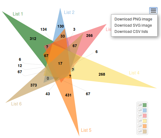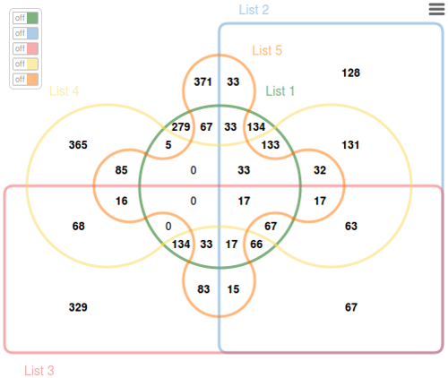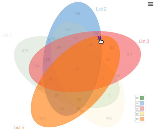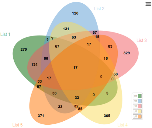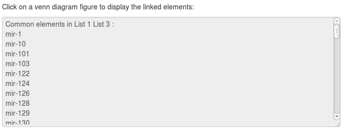 To display the specific or shared element(s) click on the intersection numbers. The linked elements are listed in the textarea below the jvenn diagram.