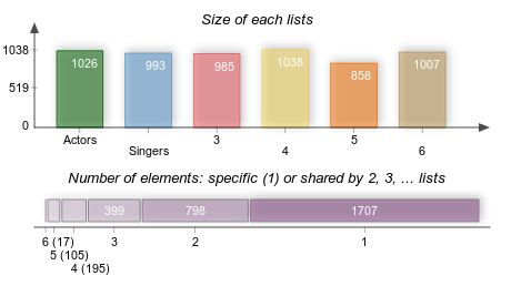 Having an overview of the list size and comparing multiple diagrams can be difficult using a Venn diagram. Thus, jvenn provides two extra charts bellow the Venn.