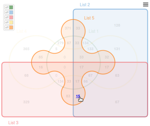 When you point an intersection count, all list(s) sharing it are highlighted.