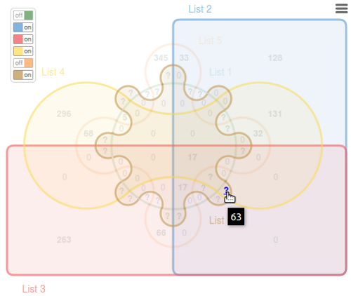 For all diagrams, when the intersection count size exceeds the allowed space, the value is substituted by a question mark. The real value pops-up on mouseover.